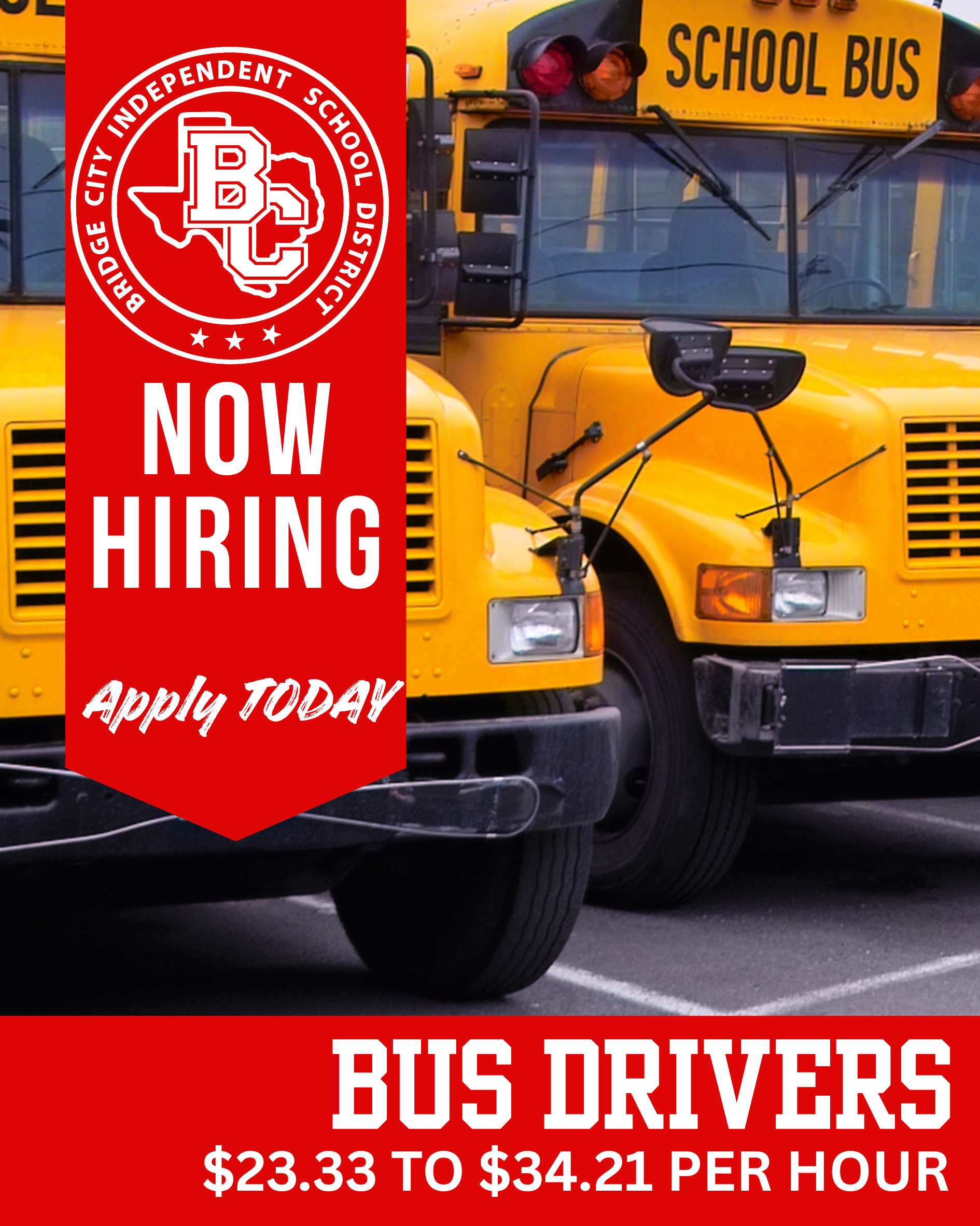 We are hiring BUS DRIVERS! If you know of anyone please send them the link to apply! https://bridgecityisd.schoolspring.com/